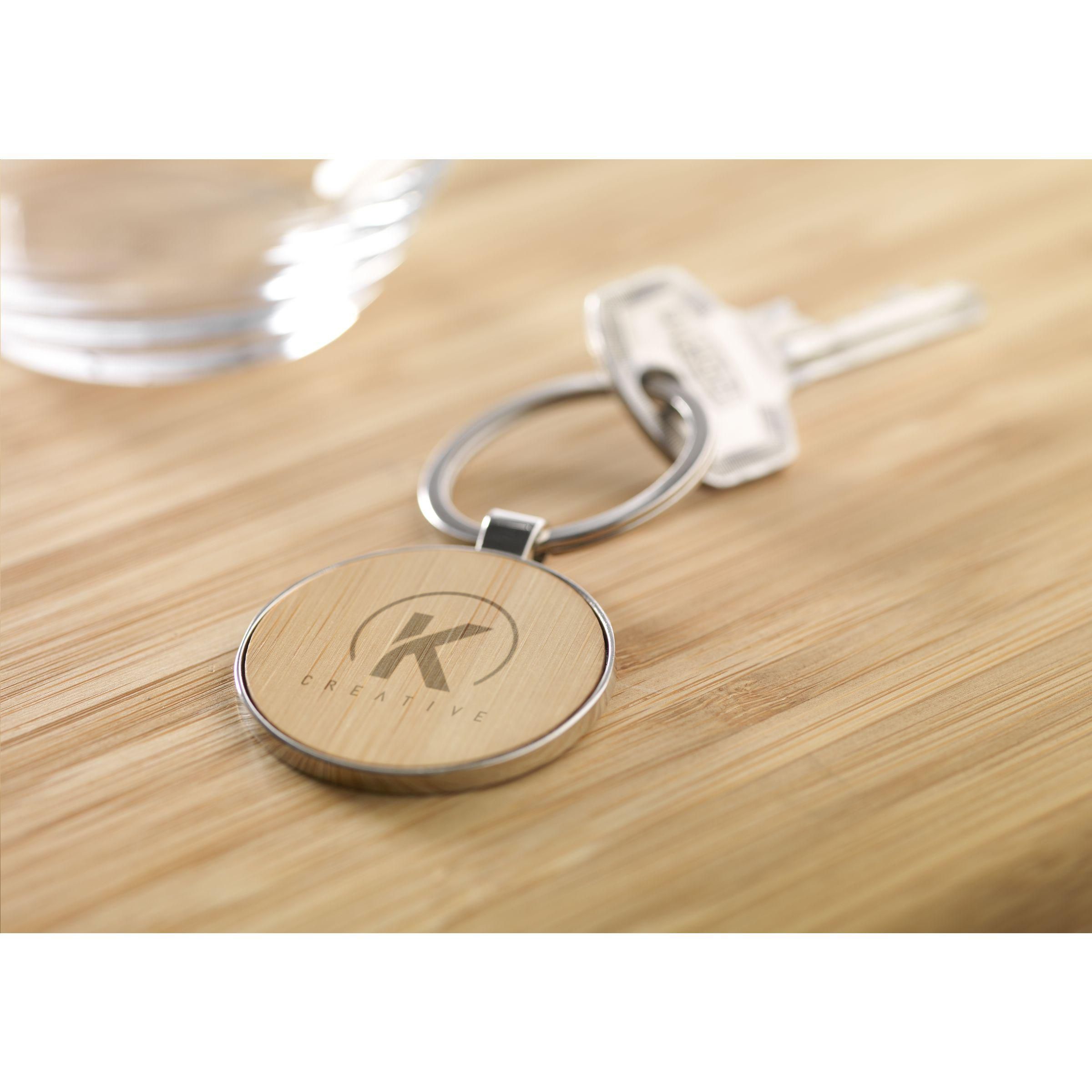 Runder, hochglänzender Schlüsselanhänger aus Metall mit Inlay aus Bambus und stabilem Schlüsselring.