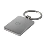 Rechteckiger, hochglänzender Schlüsselanhänger aus Metall mit Inlay aus Bambus und festem Schlüsselring. Verpackt pro Stück.