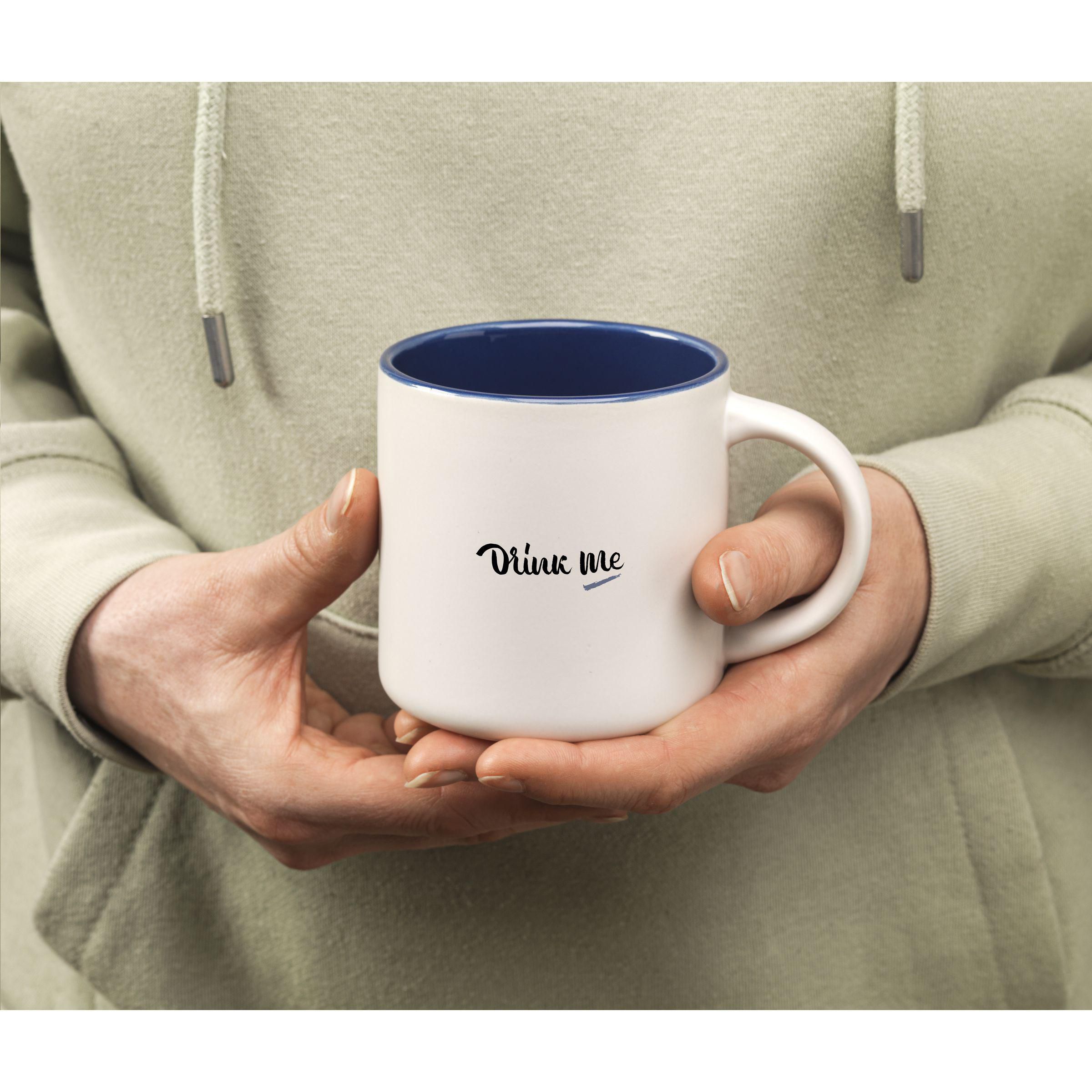 Becher aus hochwertiger Keramik. Mit matter Außenseite und einer farbigen Hochglanz-Innenseite. Spühlmachinenfest. Fassungsvermögen 330 ml.