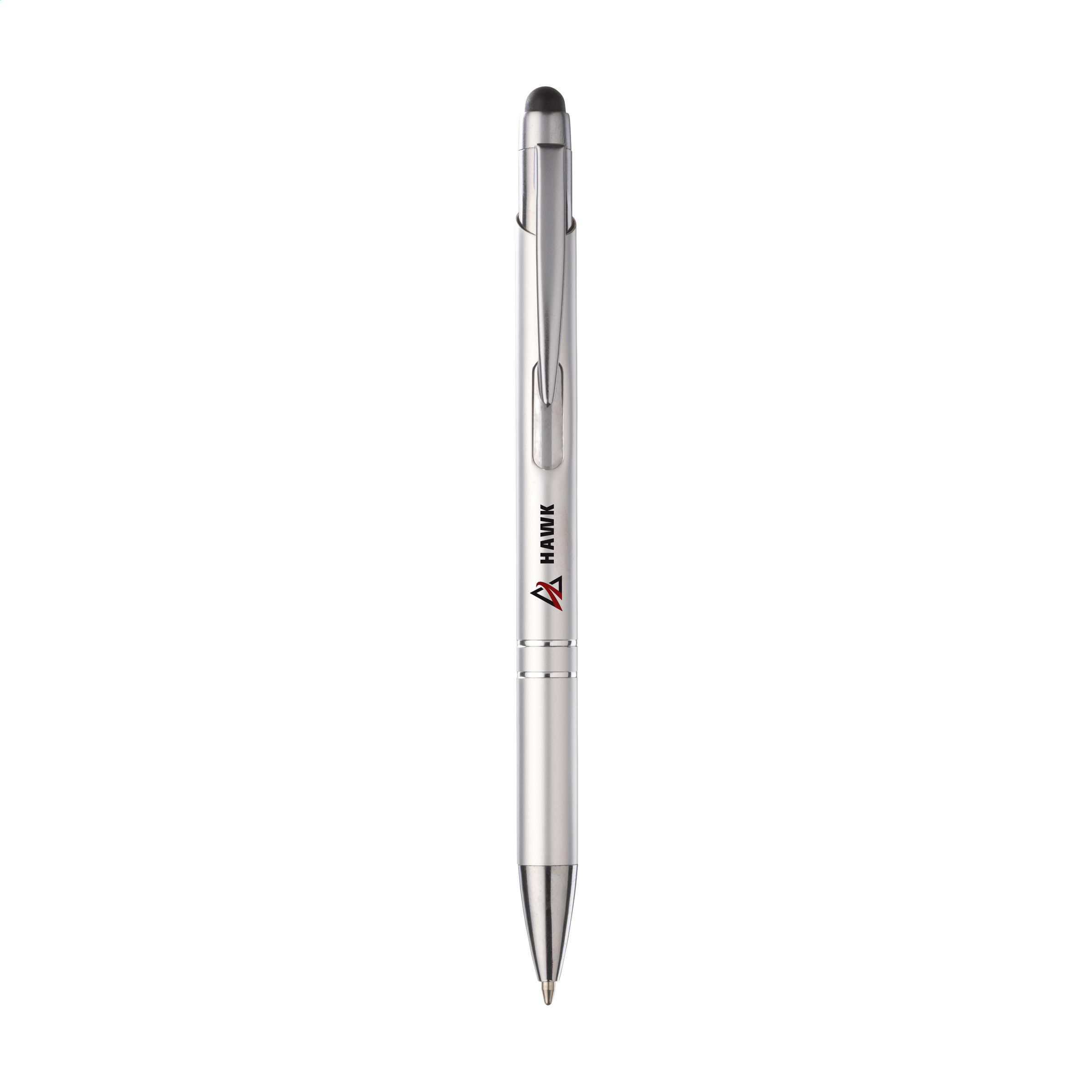 Blauschreibender Kugelschreiber mit Aluminiumgehäuse, gummierte Spitze zum Bedienen von Touchscreens (wie iPhone/iPad), mattfarbenes Metallgehäuse und Metallclip/-druckknopf.