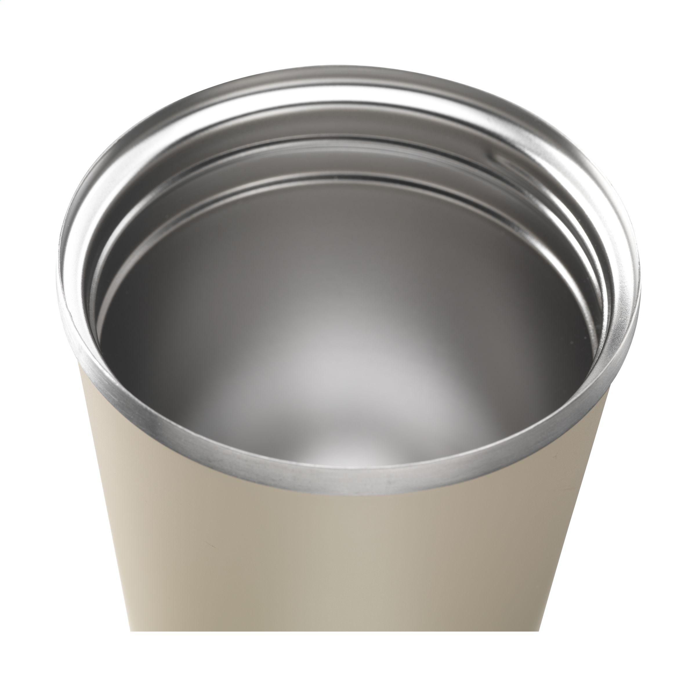 Doppelwandiger, auslaufsicherer Thermobecher aus recyceltem Edelstahl. Abgerundet mit einem matten Finish. Mit PP-Schraubdeckel, Klicköffnung und rutschfester Unterseite. Nicht spülmaschinengeeignet. RCS-zertifiziert. Recyceltes Material insgesamt: 77%. Fassungsvermögen 450 ml, gemessen bis zum Rand, ohne Deckel. Fassungsvermögen mit Deckel gemessen ca. 300 ml.Edelstahl kann viele Male recycelt werden – die Qualität des Materials bleibt dabei weitgehend erhalten. Durch die Verwendung von recyceltem Edelstahl kommt eine geringere Menge an neuen Rohstoffen zum Einsatz. Das bedeutet weniger Energieverbrauch und weniger Wasserverbrauch.