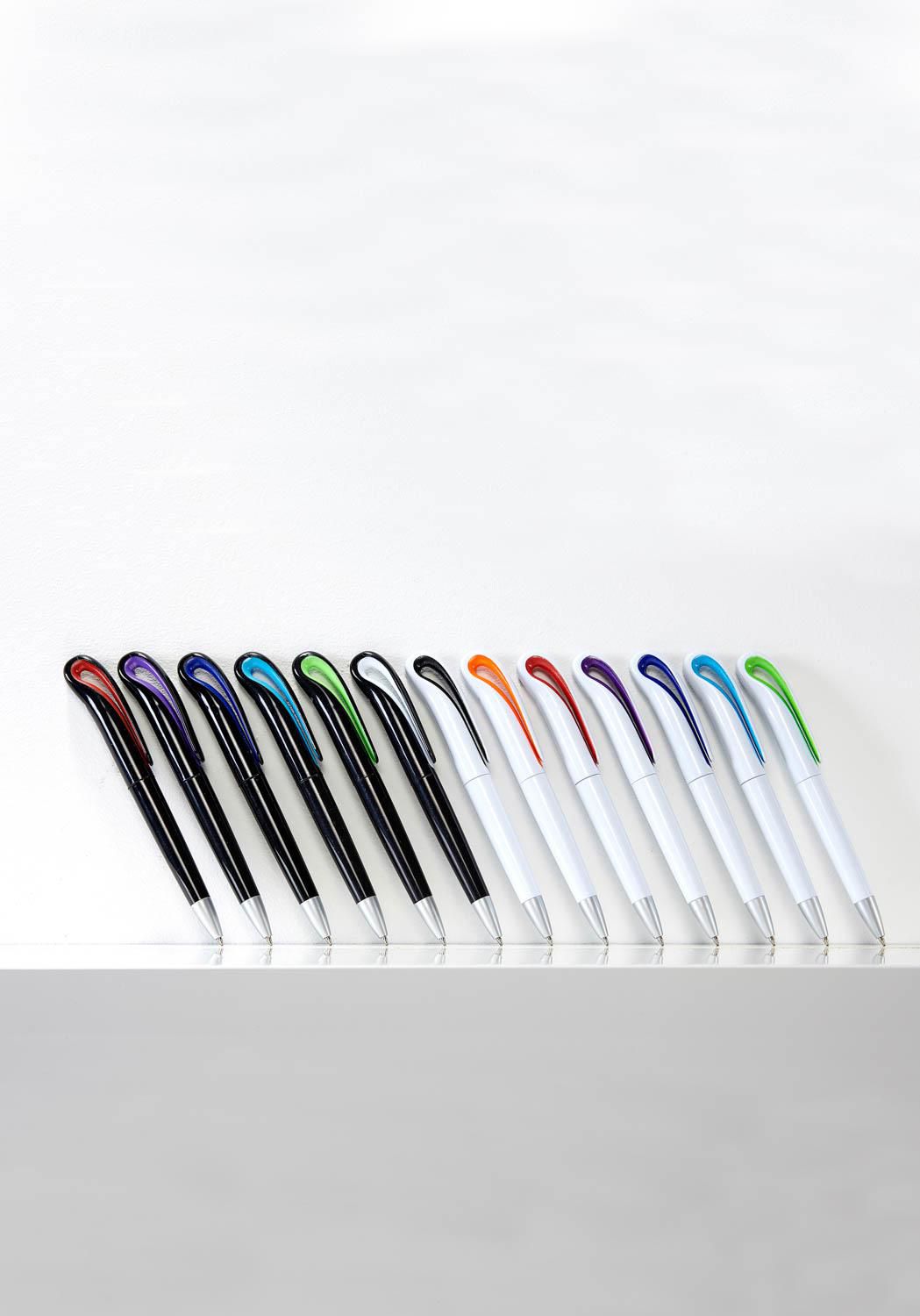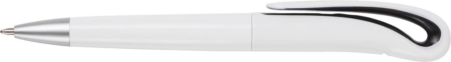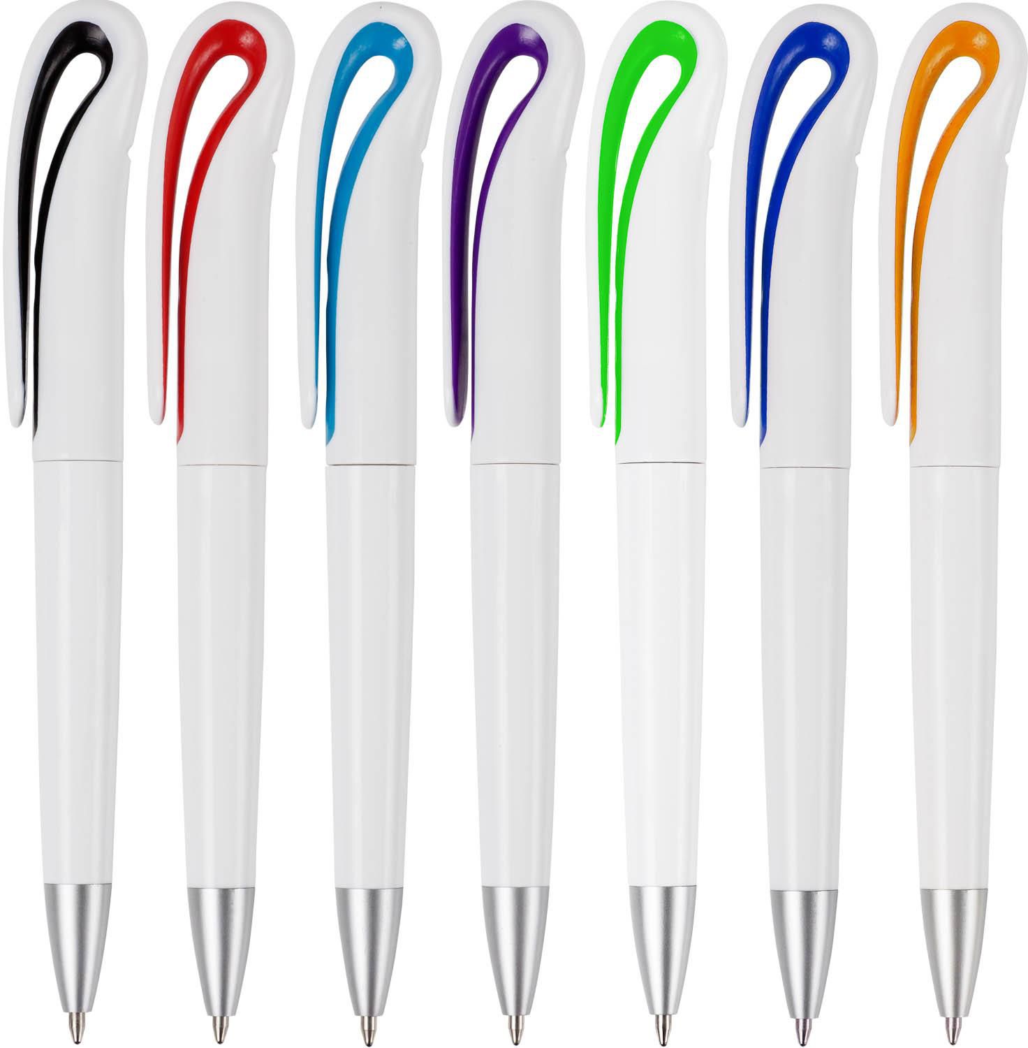 Drehkugelschreiber aus Kunststoff, weiß mit farbigen Akzenten und schwarzer Mine.