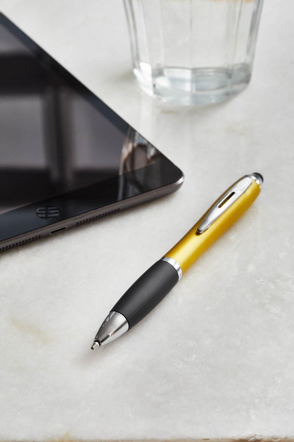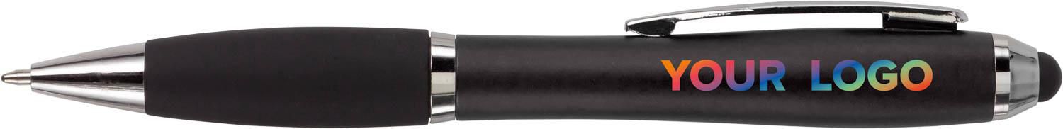 Kugelschreiber aus Kunststoff, mit Drehfunktion, Metall-Clip, gummierter Griffzone, Touchpen und schwarzer Mine.