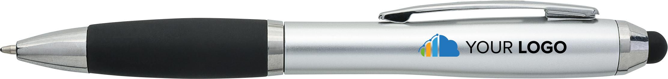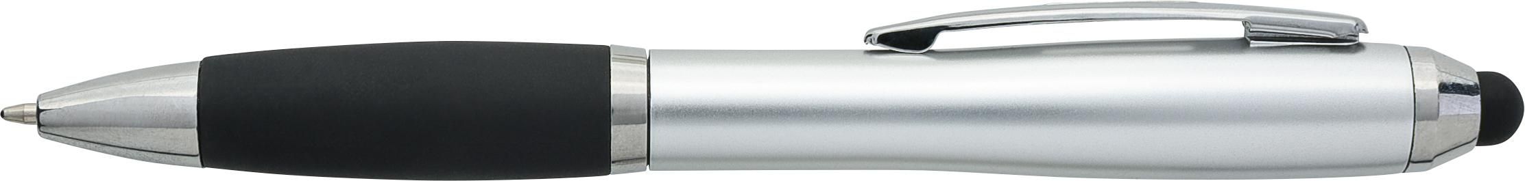 Kugelschreiber mit einfarbigem Gehäuse in Gummibeschichtung mit silbernen Akzenten und schwarzer kapazitiver Touchscreen-Stiftspitze. Hergestellt aus recyceltem ABS, wodurch Plastikmüll reduziert wird und gleichzeitig eine hohe Schlagfestigkeit und lange Haltbarkeit gewährleistet sind. Mit Druckmechanismus, blauer Tinte und eingraviertem Recycling-Logo auf dem Gehäuse.