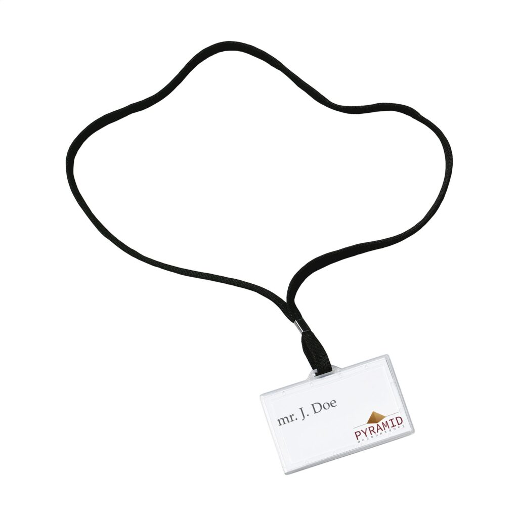 Namenschild transparent, mit Umhängeband (90 cm). Inkl. weißer Einsteckkarte.