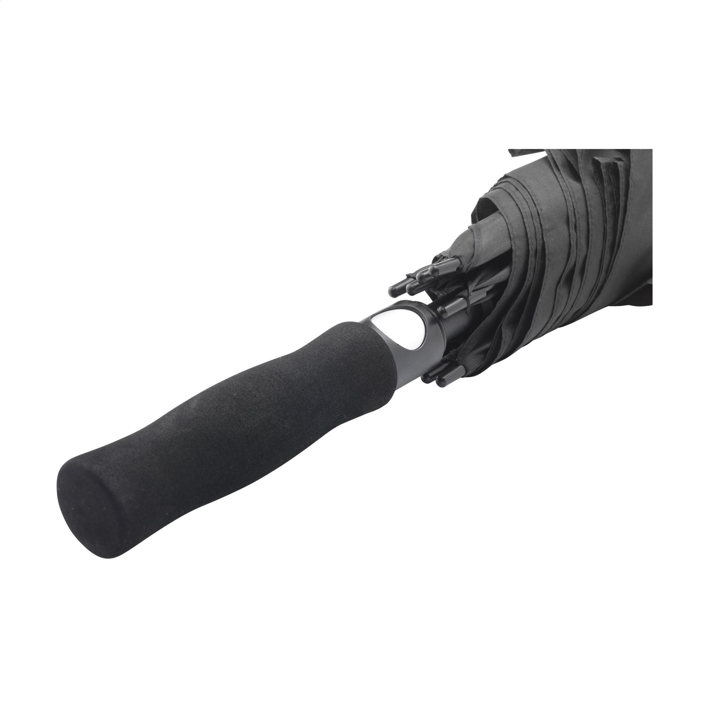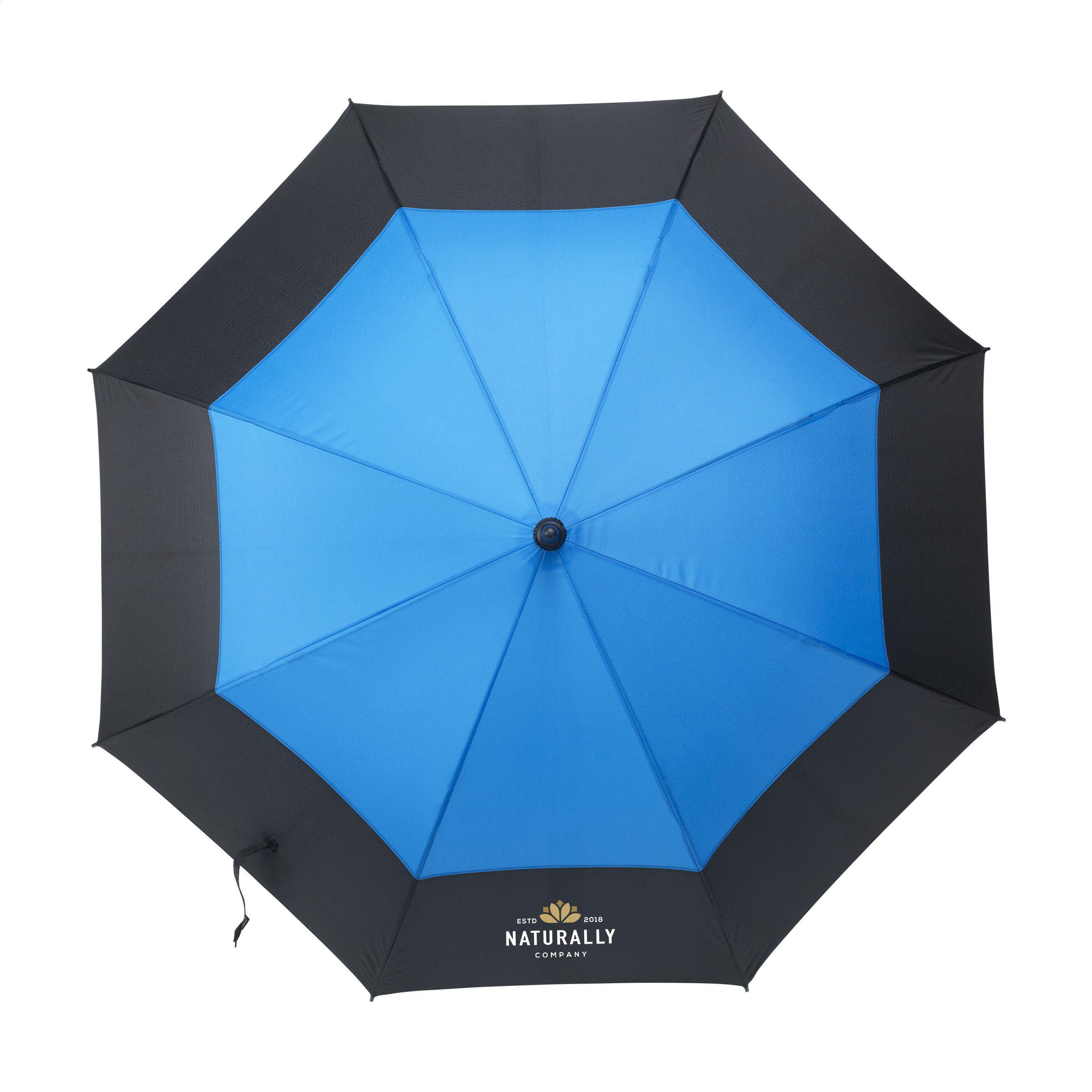 Regenschirm mit einer 2-farbigen Bespannung aus 190T RPET-Polyester. Dieser auffällige Regenschirm hat einen extragroßen Schirmdurchmesser von 120 cm. Mit automatischer Teleskopöffnung, Fiberglasrahmen und -schaft, Griff aus EVA-Weichschaum und Klettverschluss. Dieser Regenschirm wird teilweise aus recycelten PET-Flaschen hergestellt.
