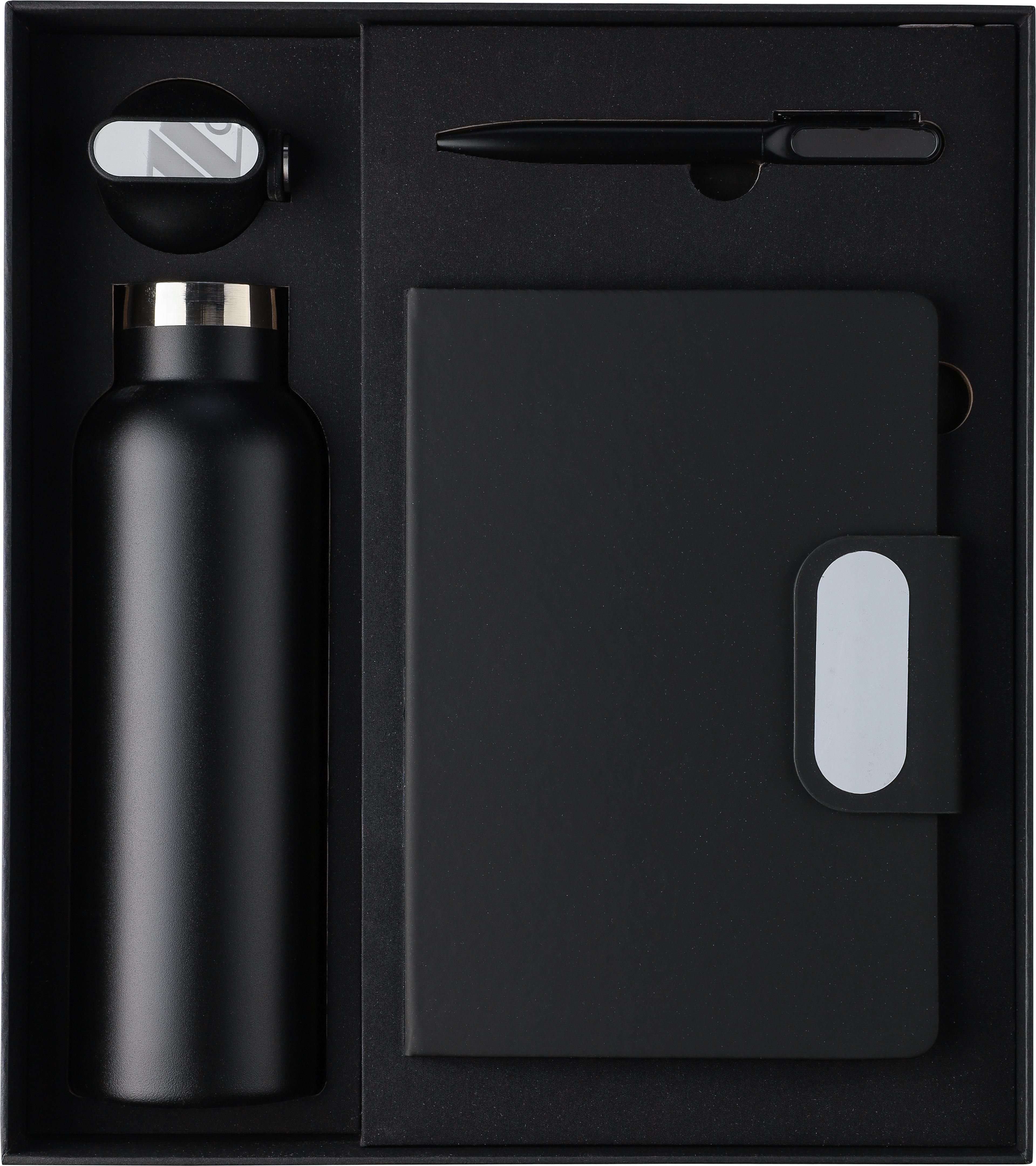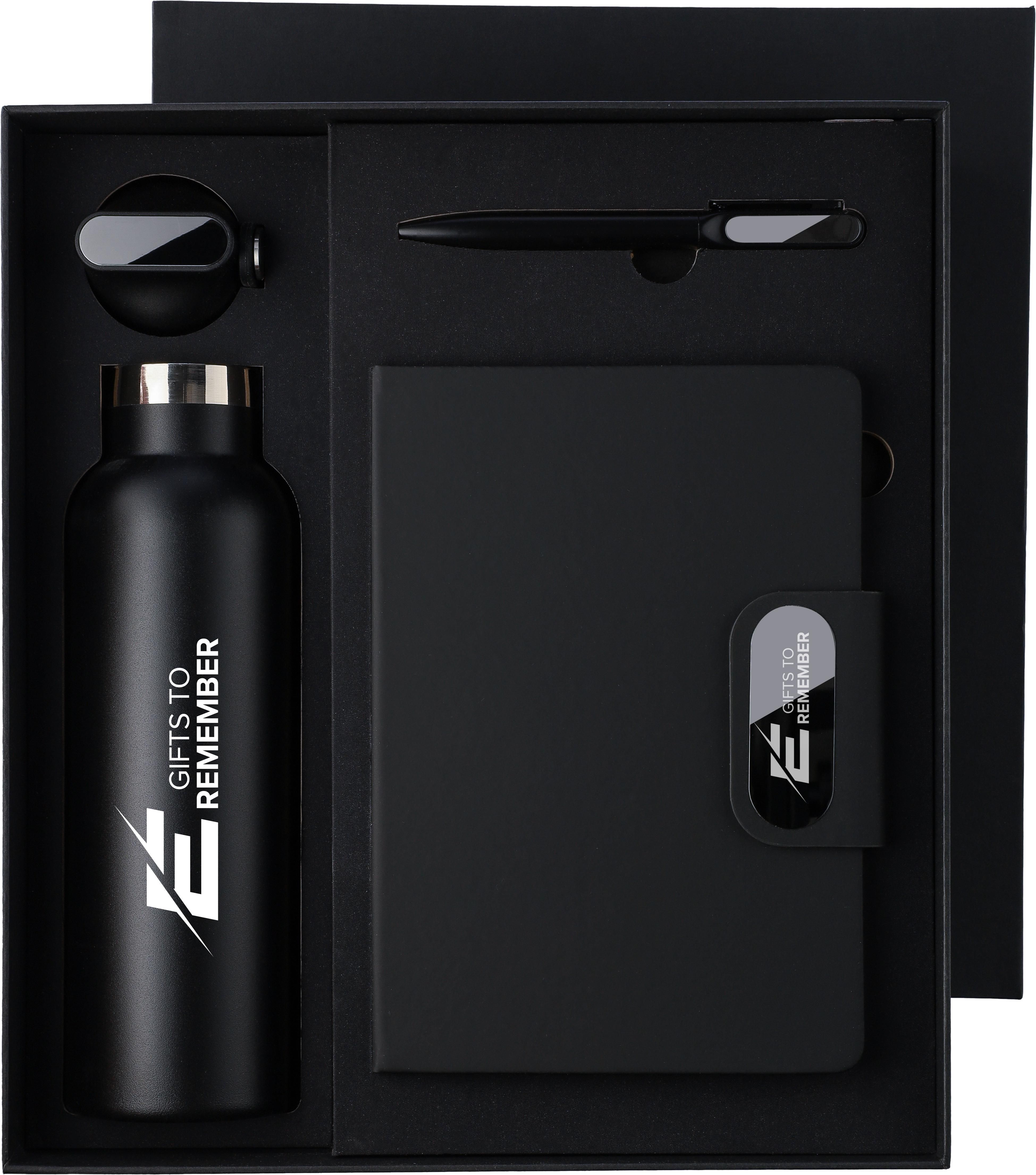 Dieses Geschenkset aus Karton besteht aus einer doppelwandigen Trinkflasche aus recyceltem Edelstahl (304) mit Silikongriff, einem Drehkugelschreiber aus recyceltem Aluminium mit blauer Tinte sowie einem Notizbuch aus recyceltem PU mit 80 Blatt 70 g/m² liniertem FSC-Papier. Das Papier in diesem Notizbuch ist FSC® Mix-zertifiziert. Das Notizbuch verfügt über ein Lesezeichen mit Band sowie einen magnetischen Metallverschluss mit Gravurplatte aus Rotguss. Alle Artikel sind mit einem recycelten Logo versehen: Es ist auf der Flasche und dem Kugelschreiber eingraviert und auf dem Notizbuch geprägt.