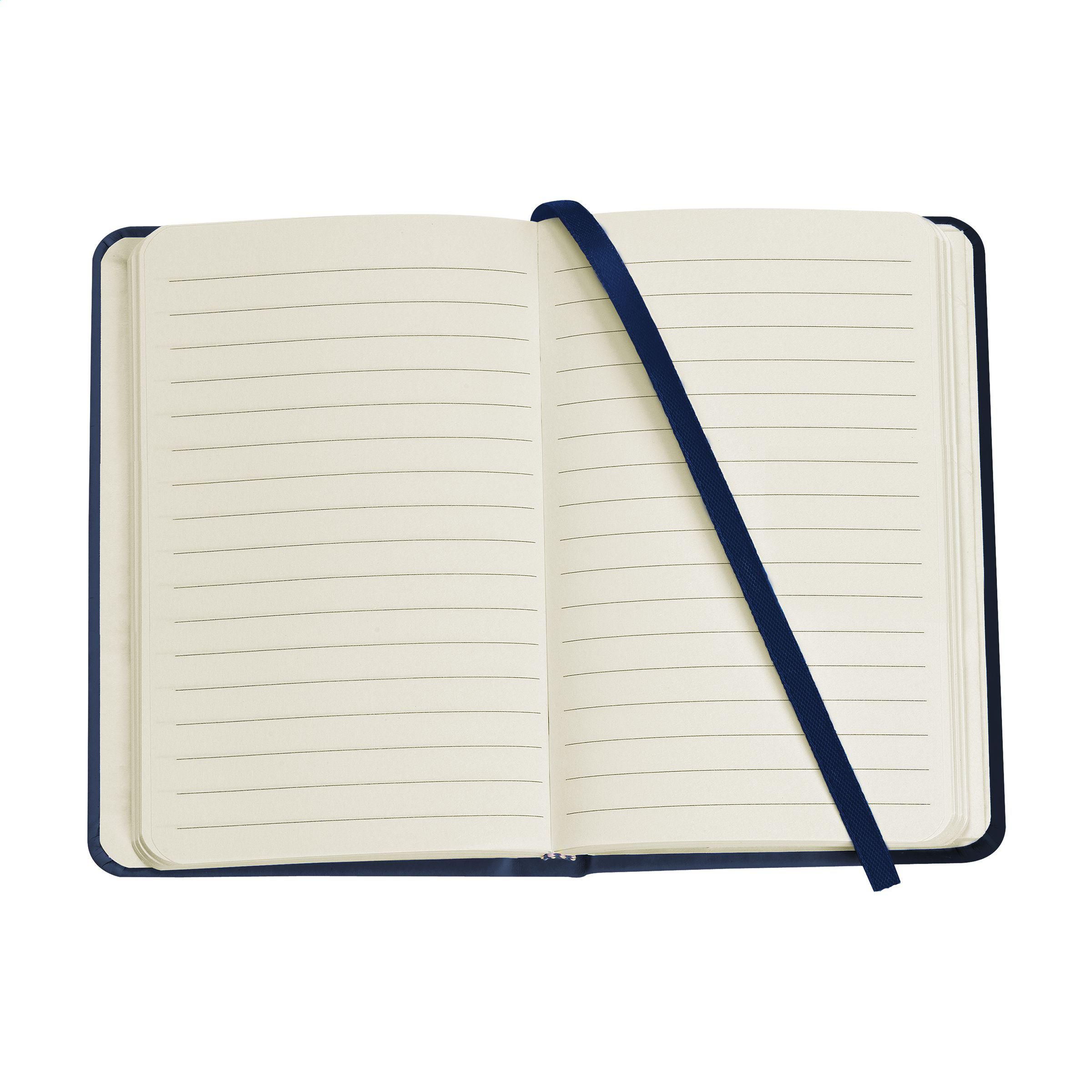 Kompaktes Notizbuch im A6-Format mit ca. 96 Blatt/192 Seiten crèmefarbenem, liniertem FSC Mix zertifiziertes Papier (80 g/m²). Mit gebundenem Rücken und hartem Umschlag, Aufbewahrfach, elastischem Band und seidener Leselitze.