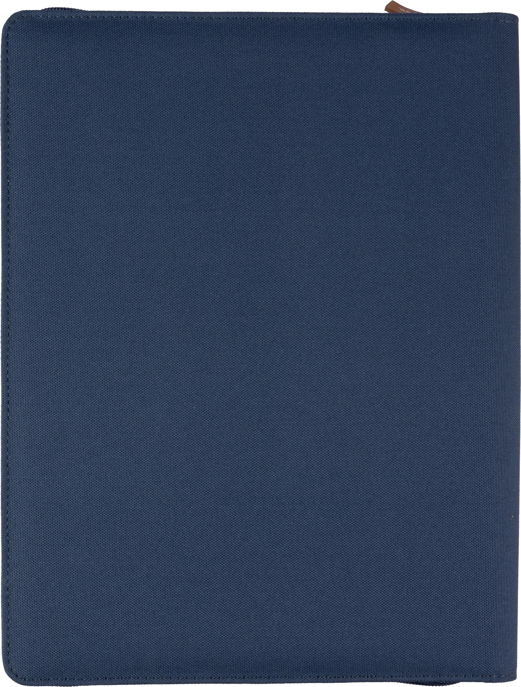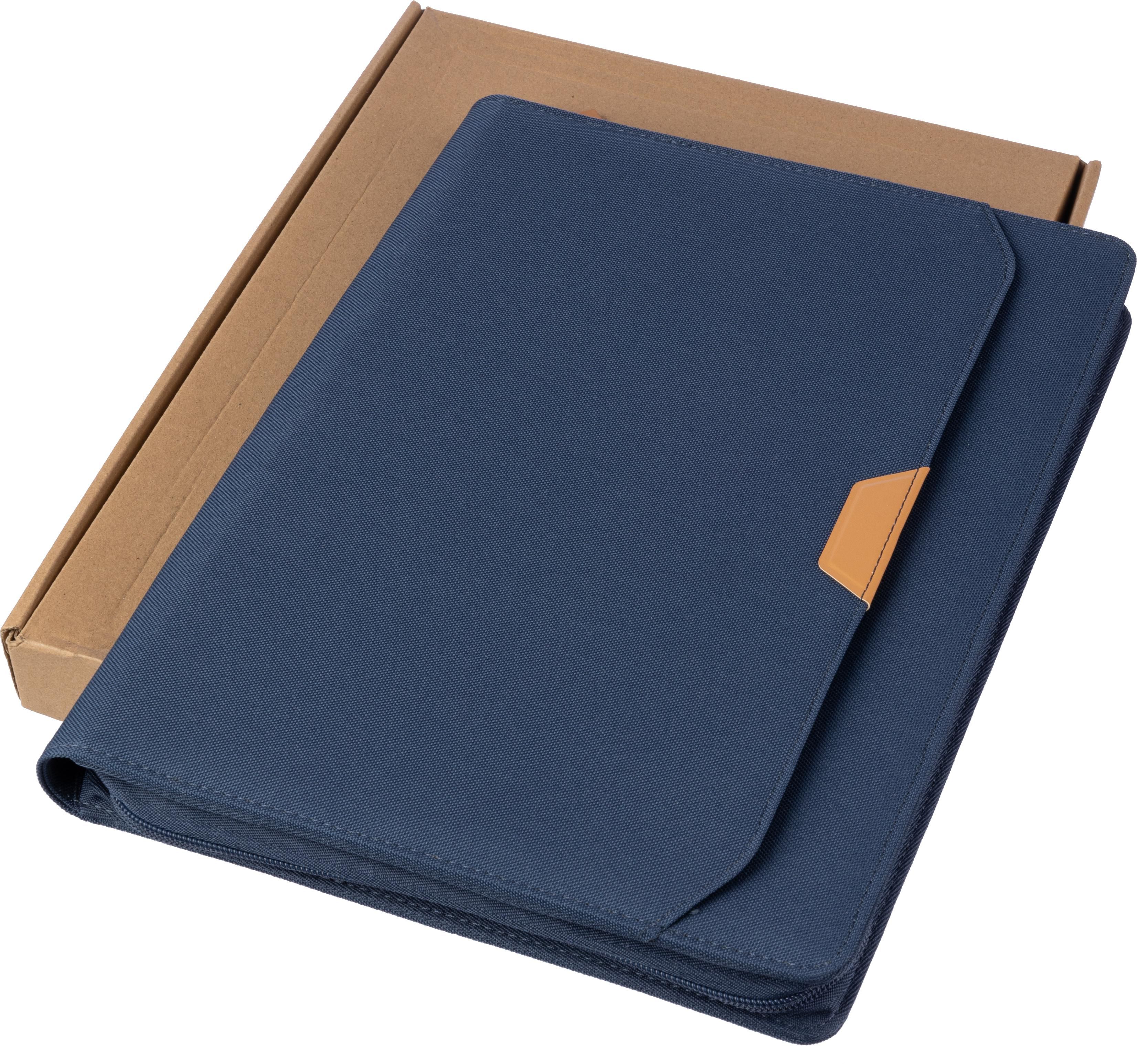 rPET-Mappe (ca. A4) mit PU-Detail und Reißverschluss. Enthält ein Notizbuch mit 20 linierten Seiten (70 g/m²), mehrere Fächer und eine Stiftschlaufe. Das Notizbuch und das Papier in dieser Mappe sind FSC® Mix-zertifiziert. Kleine Tasche auf der Vorderseite. Einzeln verpackt im braunen Kraftkarton.