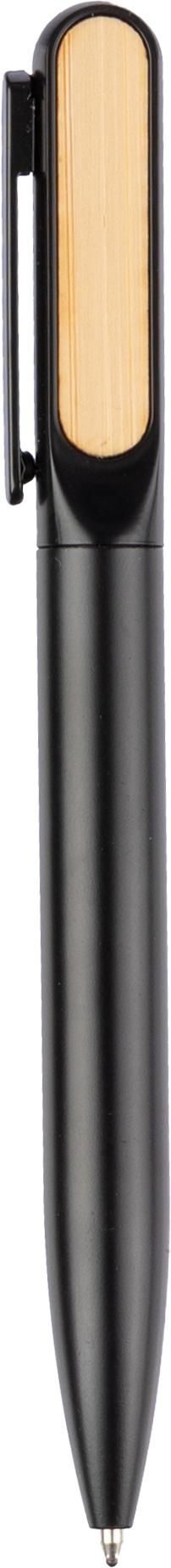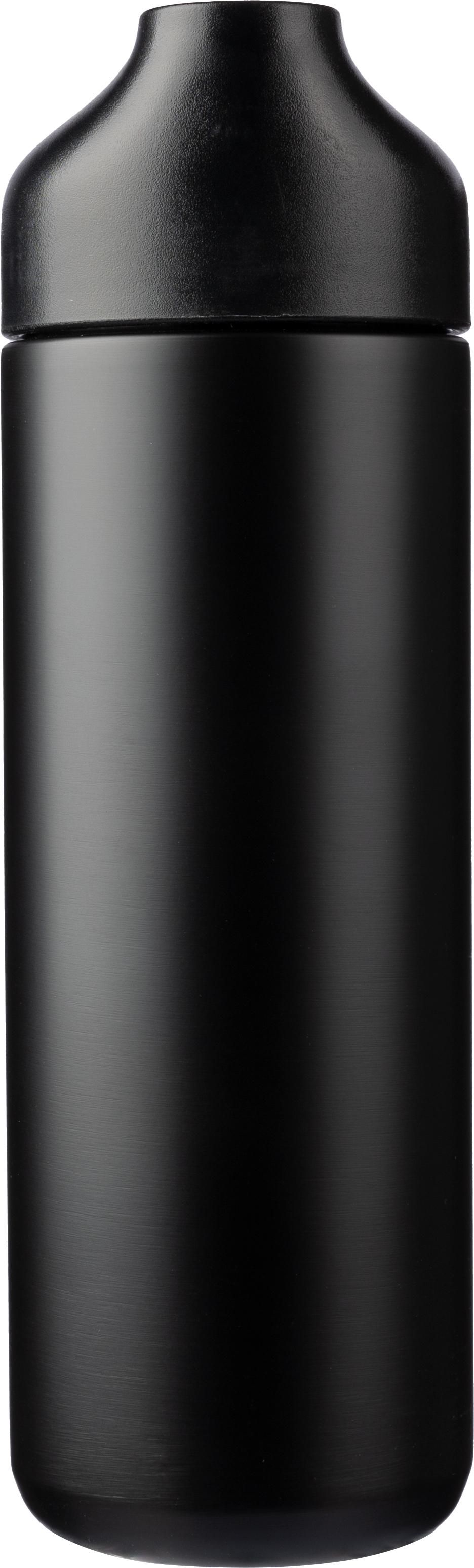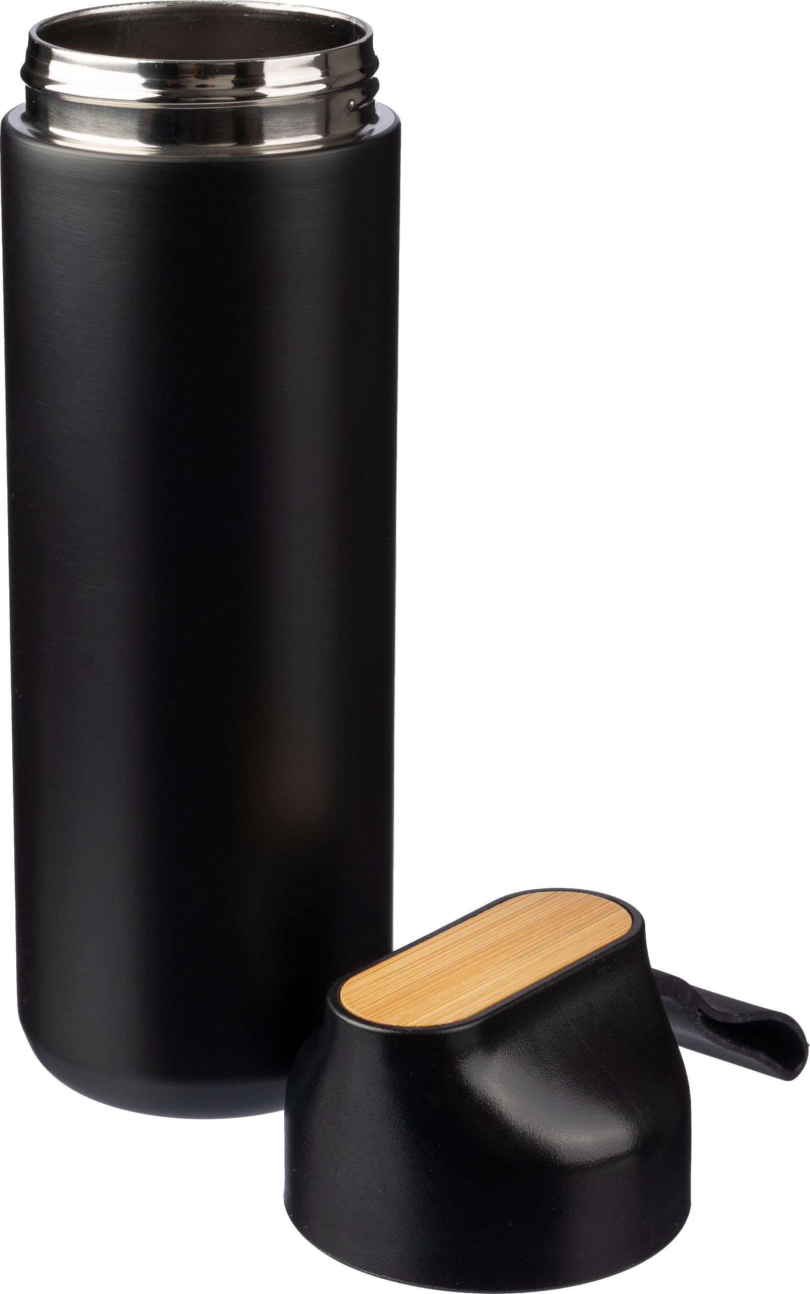 Geschenkbox aus schwarzem Karton mit 3 Artikeln: eine vakuumisolierte doppelwandige Edelstahl-Trinkflasche (640 ml) mit PP-Deckel, Silikonband und Bambus-Detail auf dem Deckel. Die Innenseite ist aus Edelstahl 304, die Außenseite aus Edelstahl 201; ein Drehkugelschreiber aus Aluminium mit mattem Finish, blauer Schrift und einem Bambus-Detail auf dem Clip; und ein Notizbuch aus rPET (300D) (ca. A5) mit 80 linierten Seiten und einem faltbaren Umschlag, der sich in einen Telefonhalter verwandeln lässt, mit einem Bambus-Detail auf dem Umschlag. Das Papier in diesem Notizbuch ist FSC® Mix-zertifiziert.