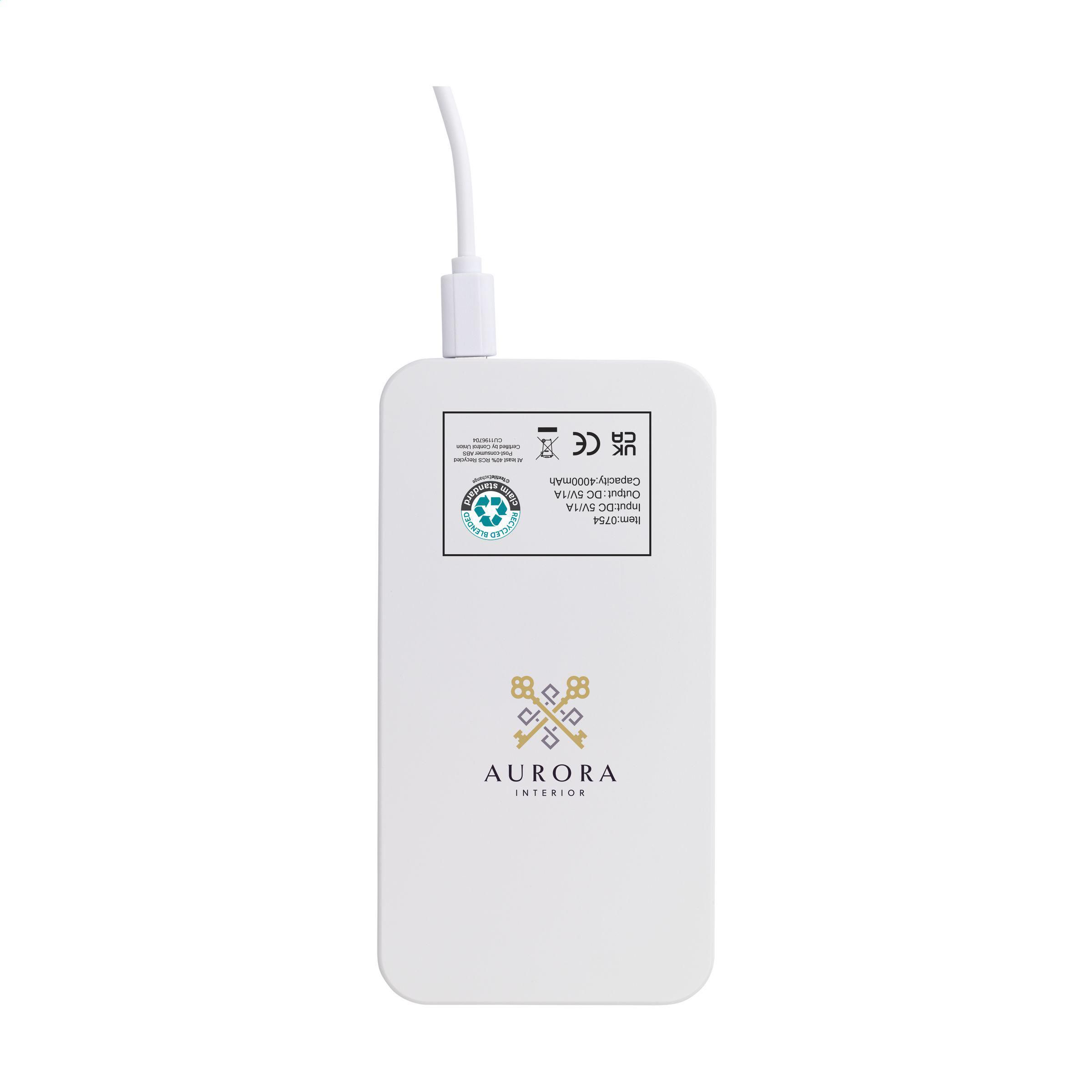 Leistungsstarkes Notladegerät mit hoher Ladekapazität mit Solarmodul und eingebautem wiederaufladbarem Polymerakku (4000 mAh). Kann mit Solarenergie oder Netzstrom (über USB-Anschluss) aufgeladen werden. Das Gehäuse ist aus recyceltem ABS gefertigt. Eingang: 5V/1A. Ausgang: 5V/1A. Inklusive Ladekabel mit USB-C-Anschluss, USB-C-Stecker und Gebrauchsanweisung. RCS-zertifiziert. Gesamtes recyceltes Material: 40%.